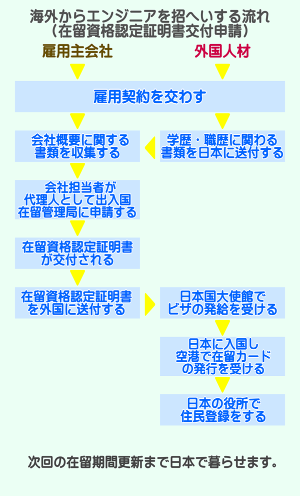 人感センサーライトを製造するA社は、新しい技術を取り入れた製品開発のためにエンジニアを募集しましたが、一向に応募がありませんでした。人材紹介会社に依頼するとベトナム人エンジニアを紹介してくれました。WEBでベトナム人を面接すると、日本語コミュニケーション能力以外のスペックはA社が求める人材でしたので採用することになりました。A社人事担当者が代理人となり、出入国在留管理局に在留資格認定証明書交付申請をしたところ、一か月ほどで証明書が交付されました。証明書をベトナム人のもとに送り、それを持って日本国政府査証を得たベトナム人は来日し、A社で商品デザインや配線の設計業務に就きました。